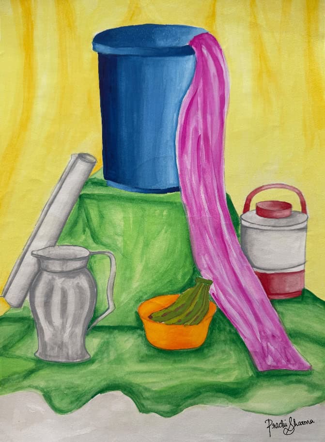 This still life composition features a collection of everyday objects arranged on a draped green cloth. The combination of a blue bucket, a pink cloth, and various kitchen items reflects the simplicity of daily life. The vibrant colors add a sense of warmth and familiarity to the scene. The play of light and shadow gives depth to the arrangement, making each object stand out. The balance between structured forms and flowing fabric creates a visually engaging contrast.
