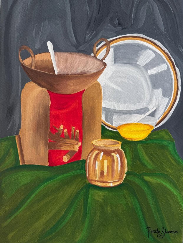 This still life painting brings together elements of tradition and simplicity. The earthen pot on the chulha symbolizes warmth and heritage, while the golden jar reflects the play of light. A glass plate with a hint of yellow adds depth and contrast. The rich green fabric draped beneath the objects enhances the composition’s vibrancy. The detailed brushwork highlights textures, from the smooth surface of the jar to the rough wood of the chulha. It is a tribute to everyday objects that hold cultural significance.