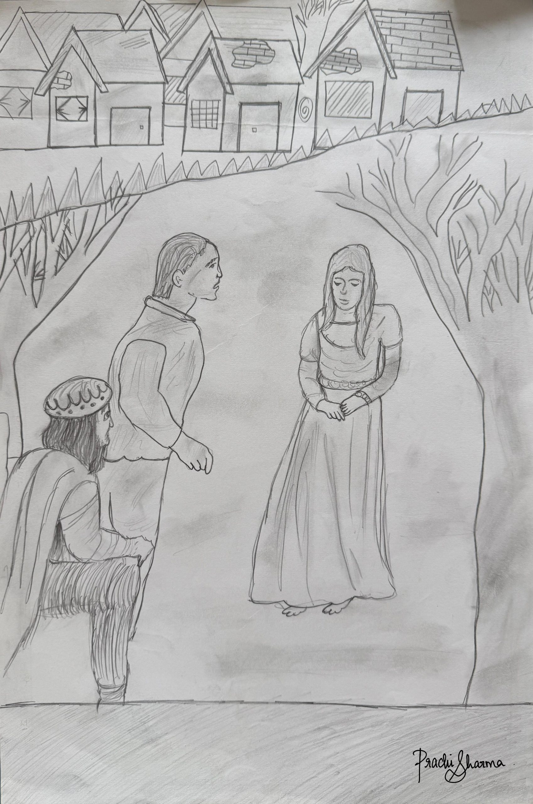 Set against a backdrop of old, rustic houses, this sketch depicts an intriguing interaction. A woman, dressed in traditional attire, stands with a hesitant expression as two men engage with her. One appears to be of noble status, suggesting a historical or medieval setting. The detailing in their clothing and surroundings suggests a moment of significance. The shading and perspective create depth, making the viewer curious about the unfolding story. The barren trees add an element of melancholy or suspense to the scene.