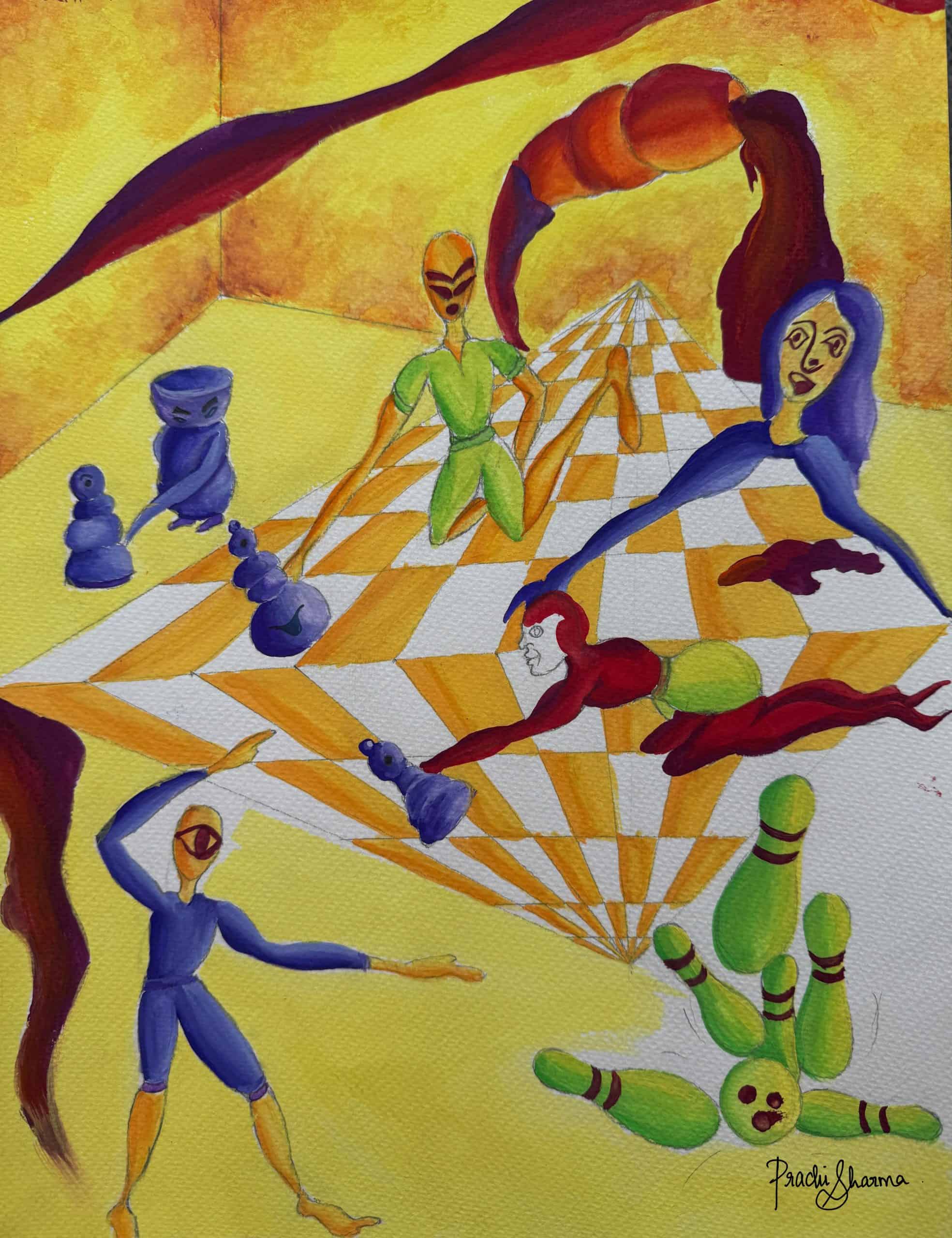 The painting portrays a surreal blend of order and chaos on a chessboard, symbolizing the unpredictable nature of life. A toddler drops a chess piece, disrupting the structured game, while a spilled drink represents loss of control. The toddler’s sister, with an intense expression, reflects frustration and emotional tension. Amid this disorder, a figure engaged in bowling suggests an attempt to regain control through play. The contrasting colors and distorted figures evoke a sense of unease, highlighting the fragile balance between order and chaos.