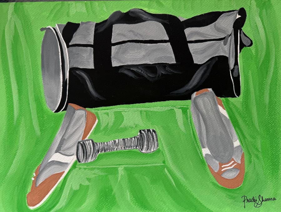 A gym bag, sneakers, and a dumbbell rest on a bright green surface. The shoes, slightly worn, tell a story of persistence. The dumbbell symbolizes strength built over time. The scene captures a pause between effort and achievement. In stillness, progress quietly takes form.