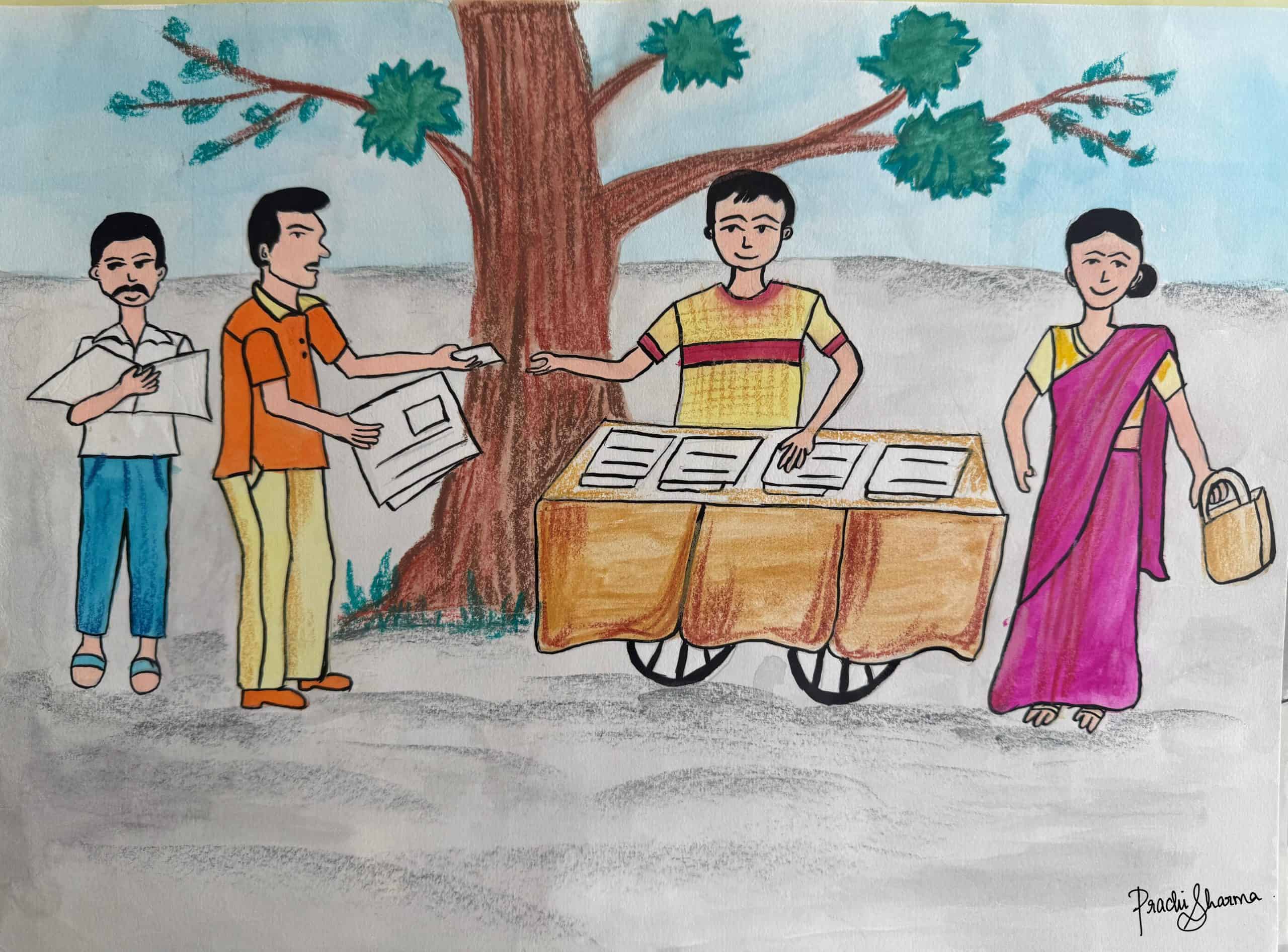 Under the shade of a sturdy tree, a young vendor arranges newspapers with care. A man in an orange shirt reaches out, exchanging coins for the latest headlines, while another browses nearby. A woman in a flowing pink sari walks past, her bag swinging gently by her side. The rhythm of daily life flows through this simple yet familiar scene.