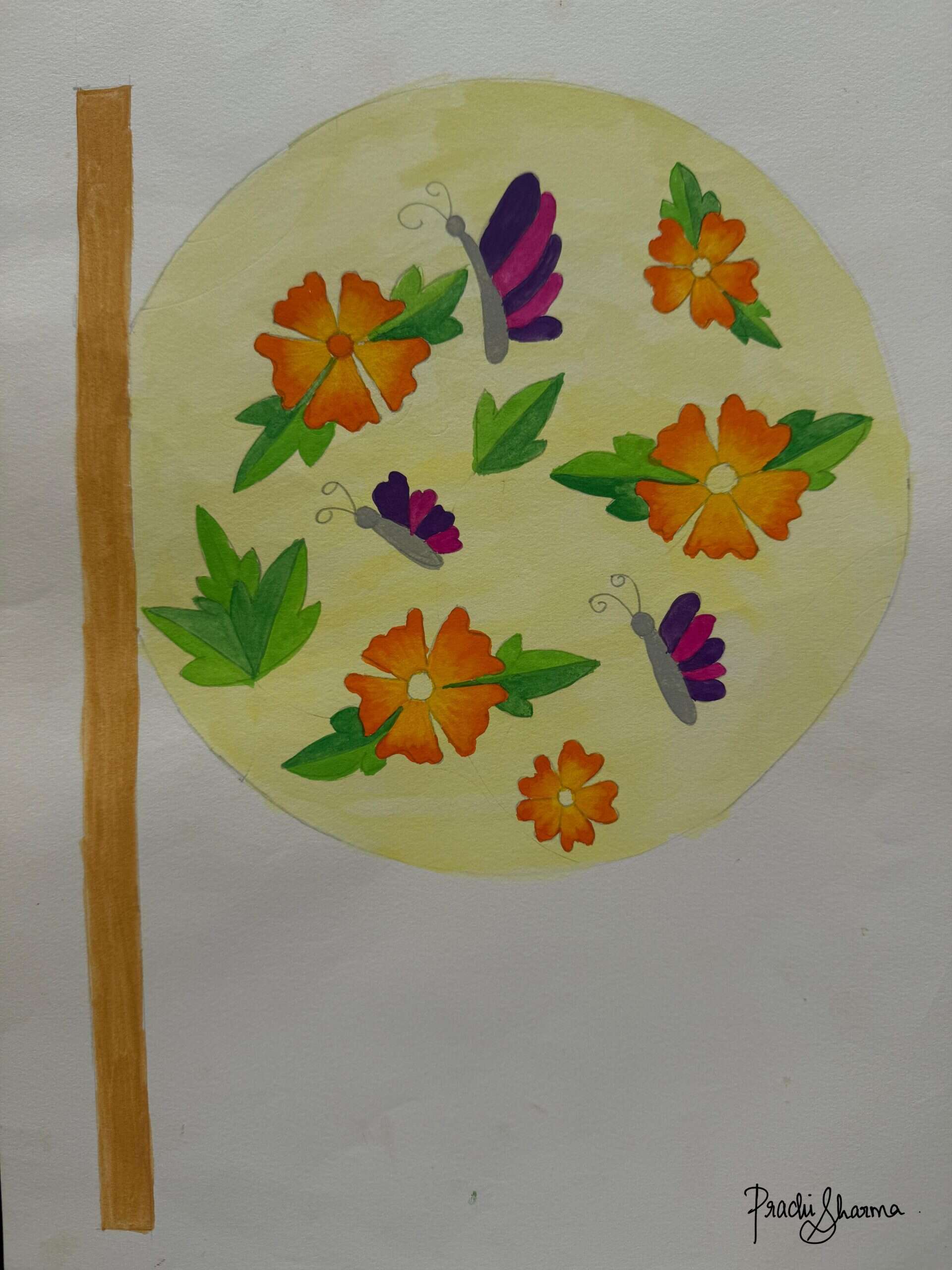 This artwork is inspired by traditional hand fans, featuring a delicate combination of flowers and butterflies. The vivid orange flowers and purple butterflies create a striking contrast against the soft yellow background. Flowing green leaves and stems add movement, enhancing the organic feel of the composition. The wooden handle on the side makes the painting resemble an actual handheld fan. This piece beautifully captures the elegance of nature in a traditional yet artistic form.