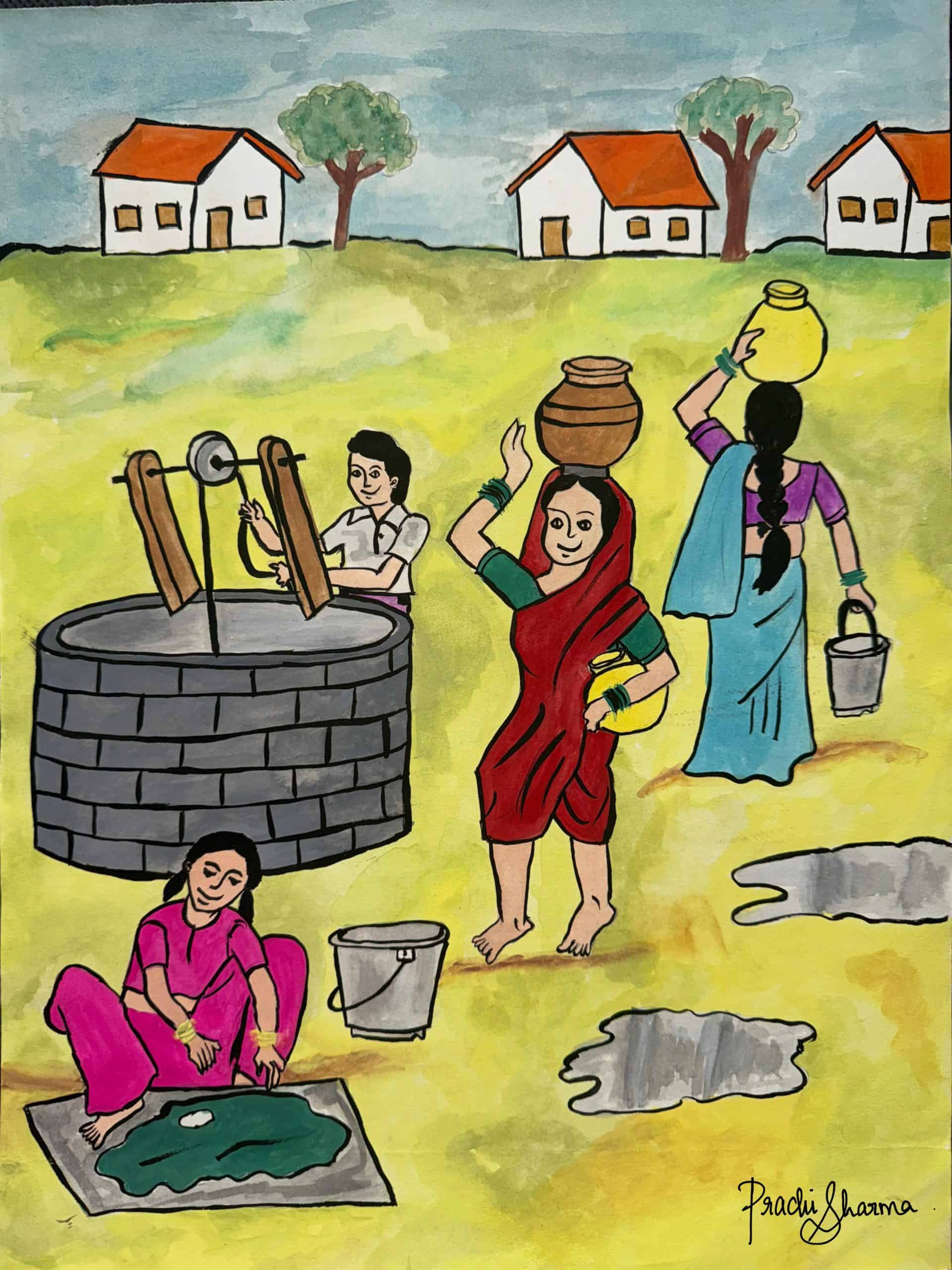 This painting depicts a lively village scene where women fetch water from a well. A woman in a red saree carries a pot on her head, symbolizing strength and daily life. Others are seen washing clothes and drawing water, showcasing community bonding. The background features simple houses, trees, and fields, creating a peaceful rural ambiance. The artwork highlights the beauty of tradition and self-sufficiency in village life.